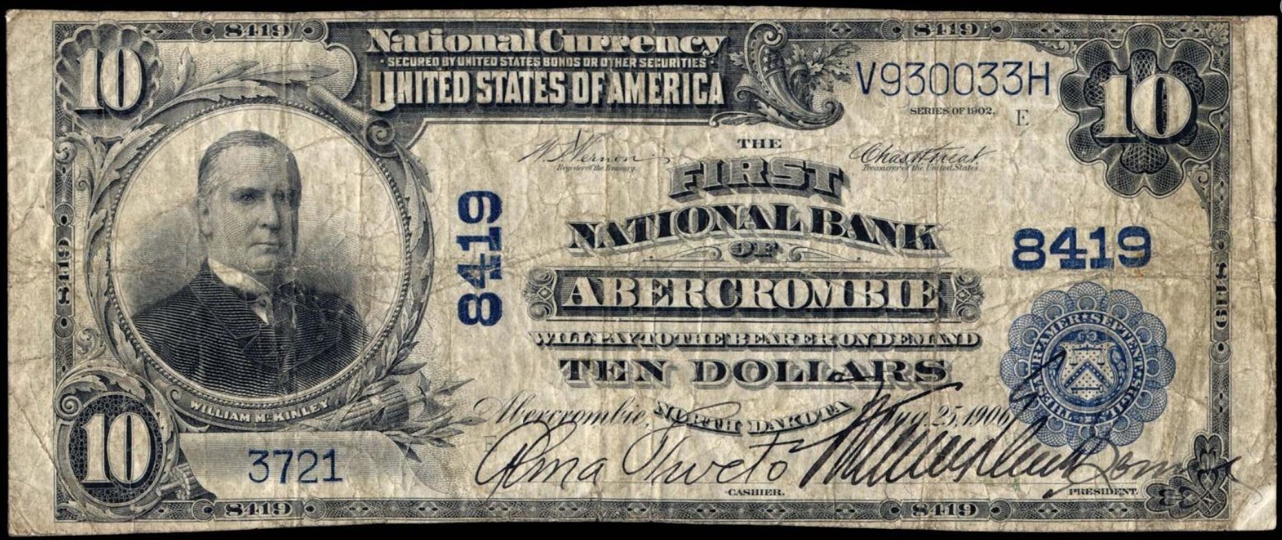 | ND | Abercrombie | 8419 | 1 | The First National Bank of | 1902PB | 10 | 3721 | E | N | Fine 12 | PMG | Image | |