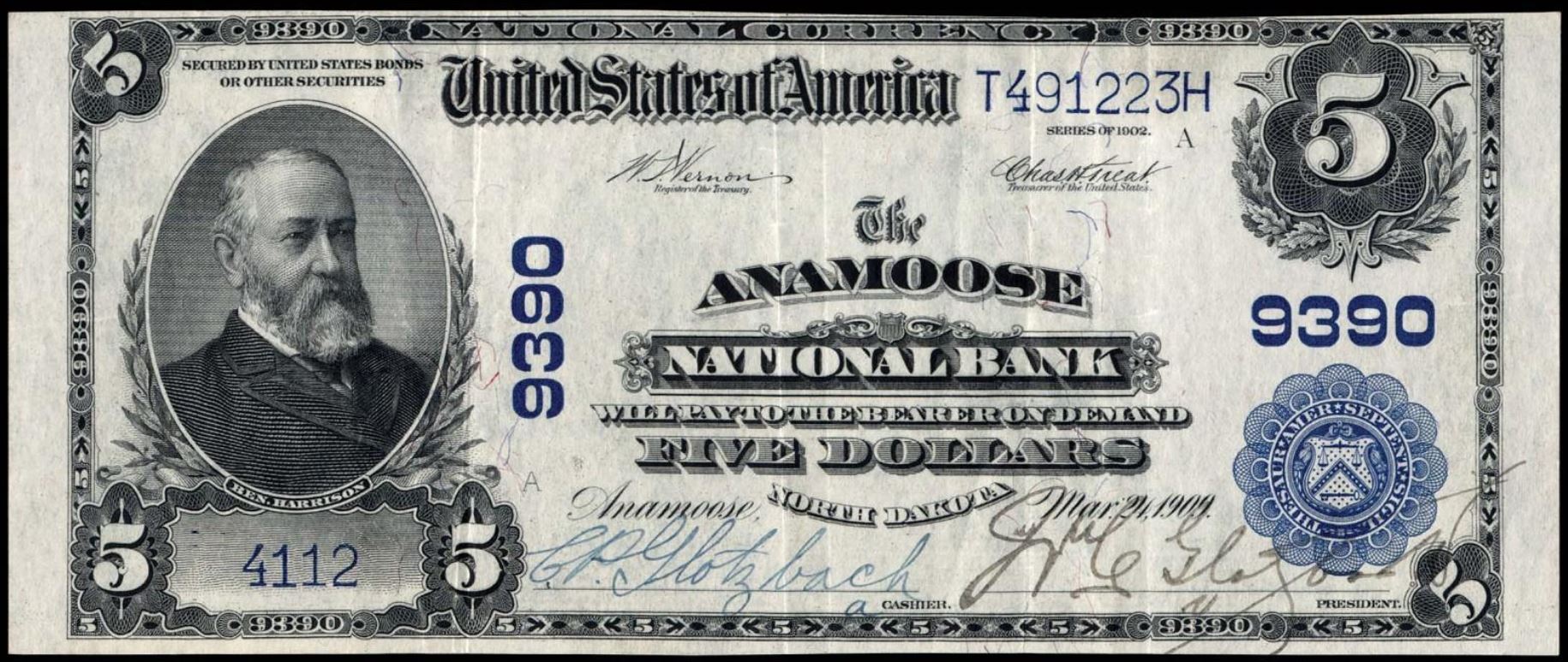 | ND | Anamoose | 9390 | 1 | The Anamoose National Bank | 1902PB | 5 | 4112 | A | N | VF 30 EPQ | PMG | Image | Female Asst Cashier signer Cornelia P. Glotzbach |