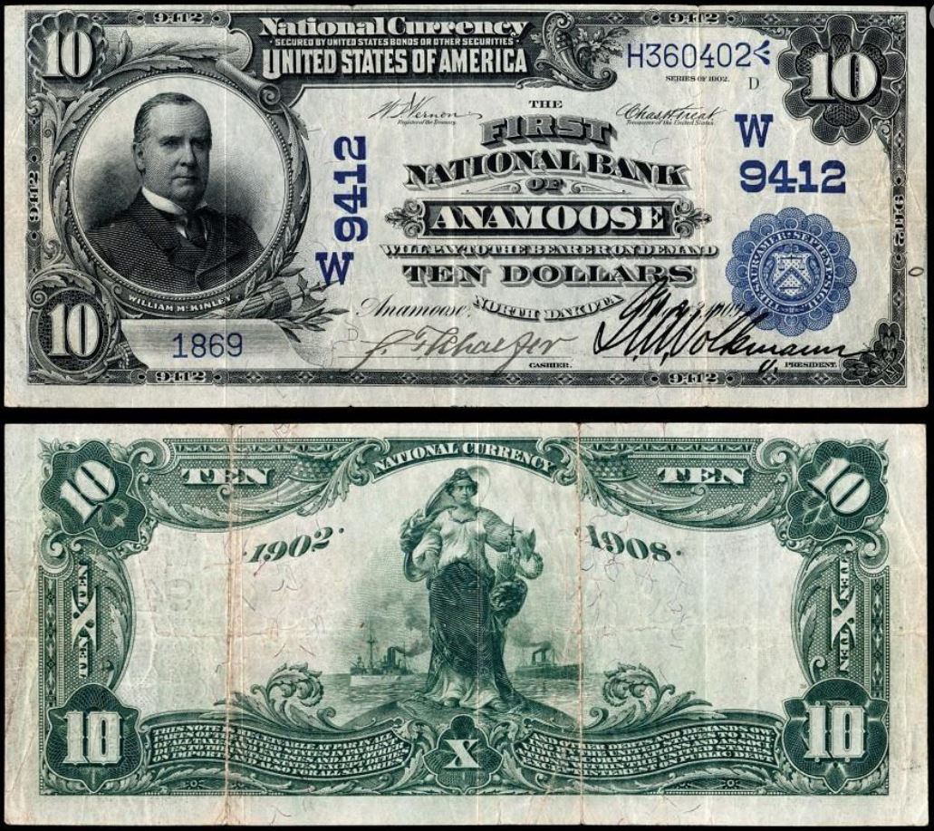 | ND | Anamoose | 9412 | 1 | The First National Bank of | 1902DB | 10 | 1869 | D | N | VF 25 | PMG | Image | Last note issued by this bank! |