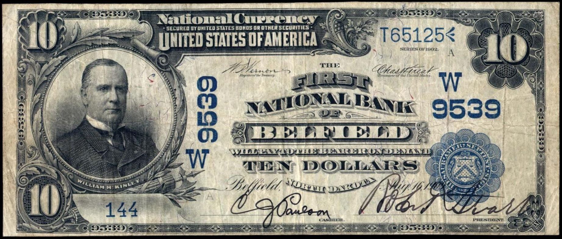 | ND | Belfield | 9539 | 1 | The First National Bank of | 1902DB | 10 | 144 | A | N | Fine 15 | PMG | Image | |