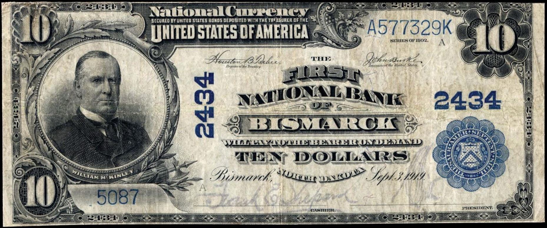 | ND | Bismarck | 2434 | 1 | The First National Bank of | 1902PB | 10 | 1144 | A | N | VF 25 | PMG | Image | |