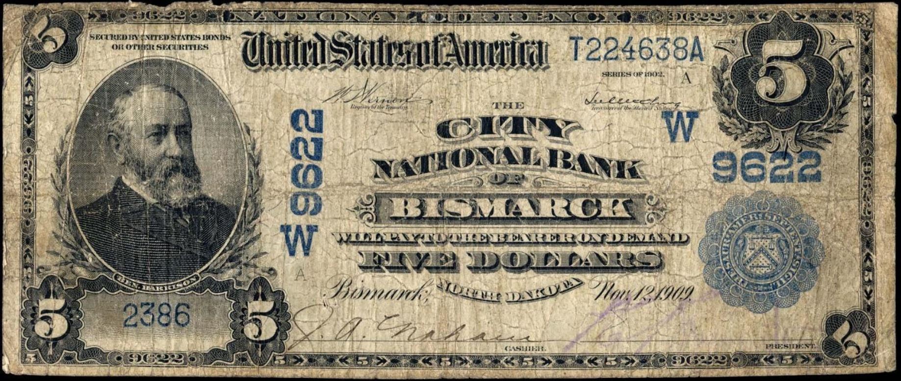 | ND | Bismarck | 9622 | 1 | The City National Bank of | 1902DB | 5 | 2386 | A | N | VG 10 | PMG | Image | |
