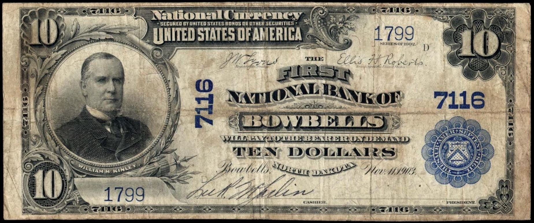 | ND | Bowbells | 7116 | 1 | The First National Bank of | 1902PB | 10 | 1799 | D | N | Fine 12 | PMG | Image | |
