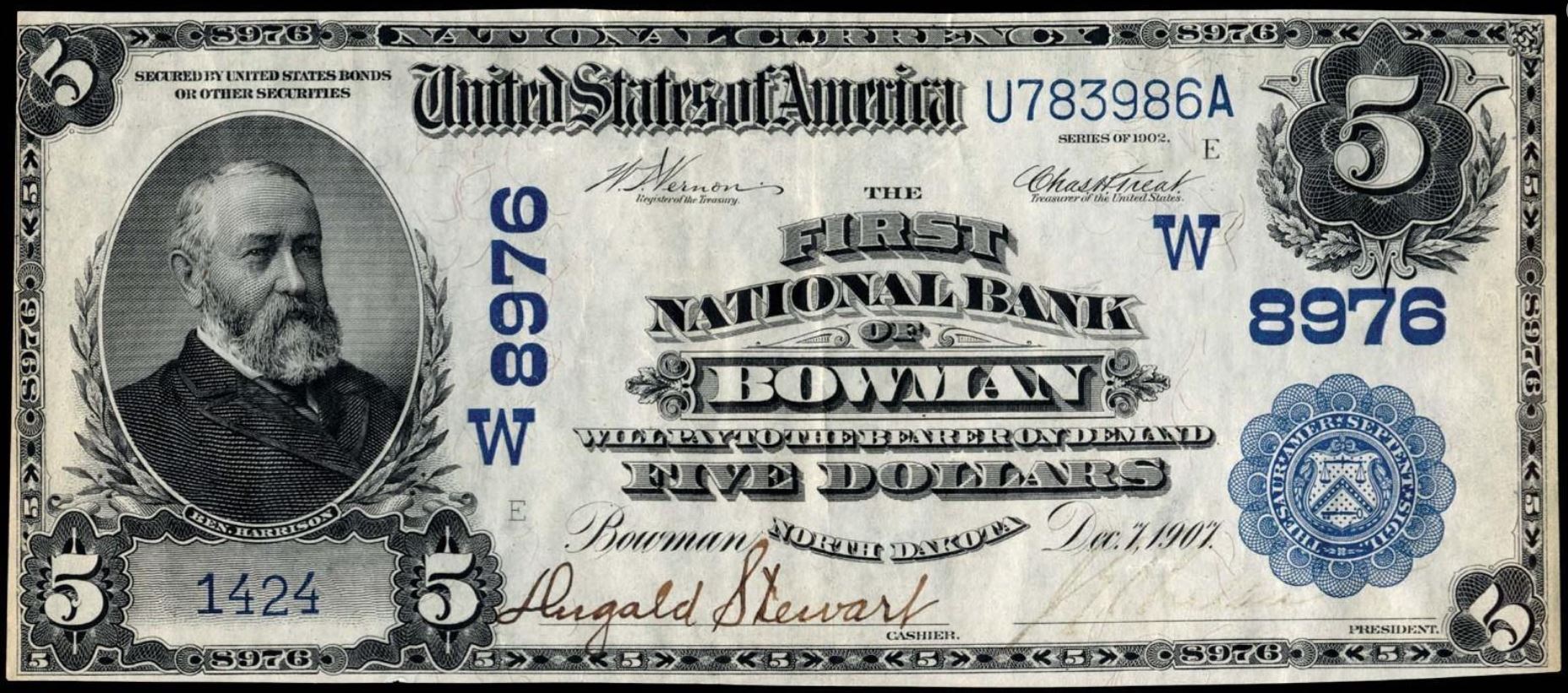 | ND | Bowman | 8976 | 1 | The First National Bank of | 1902DB | 5 | 1424 | E | N | EF 40 | PMG | Image | |