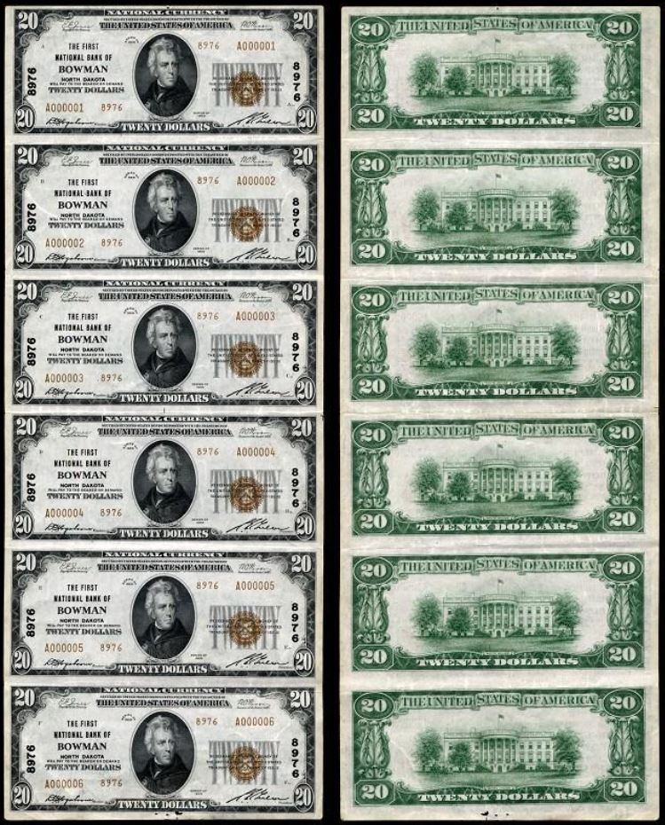 | ND | Bowman | 8976 | 1 | The First National Bank of | 1929T2 | 20 | 1 | N | EF 40 | PMG | Image | Uncut sheet SN: 1-6 | |