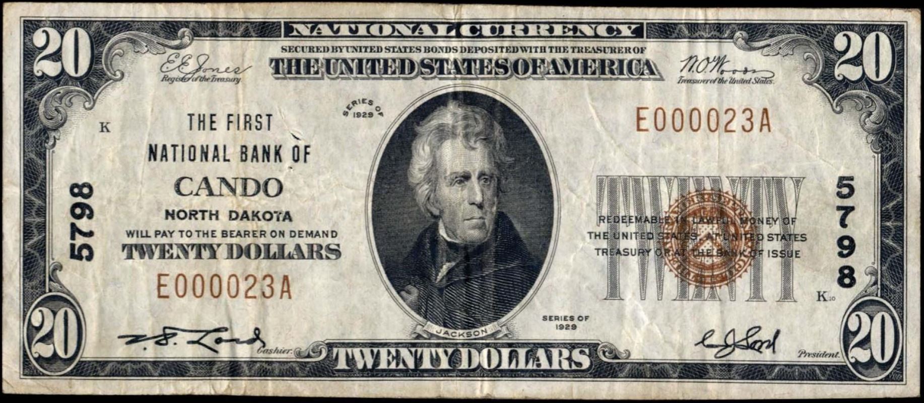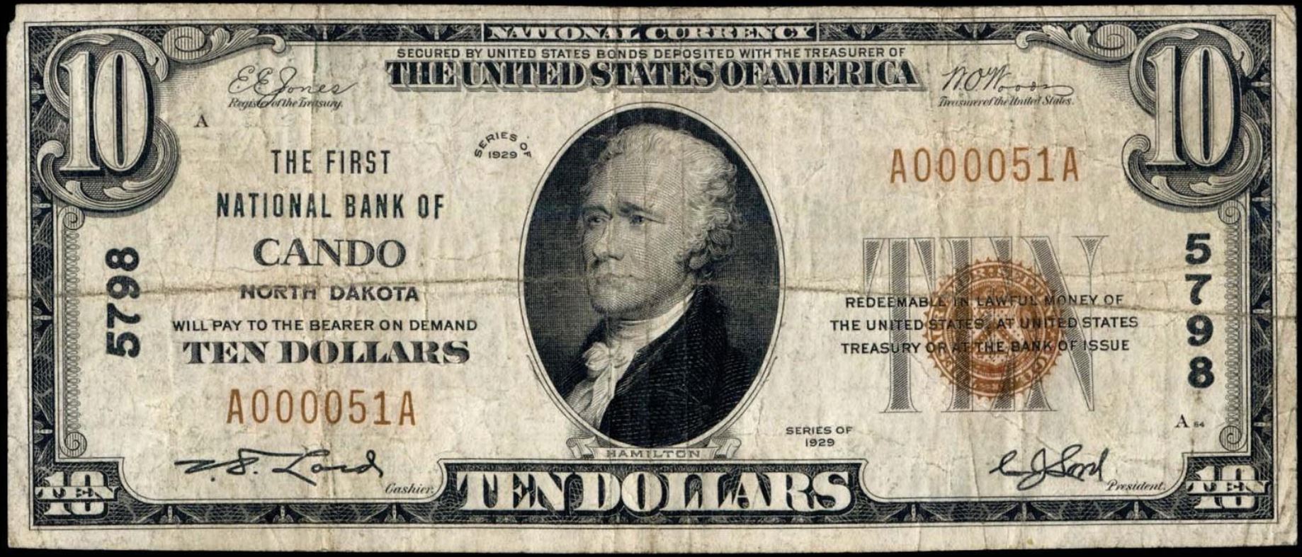 | ND | Cando | 5798 | 1 | The First National Bank of | 1929T1 | 10 | 51 | A | N | VF 20 | PMG | Image | |