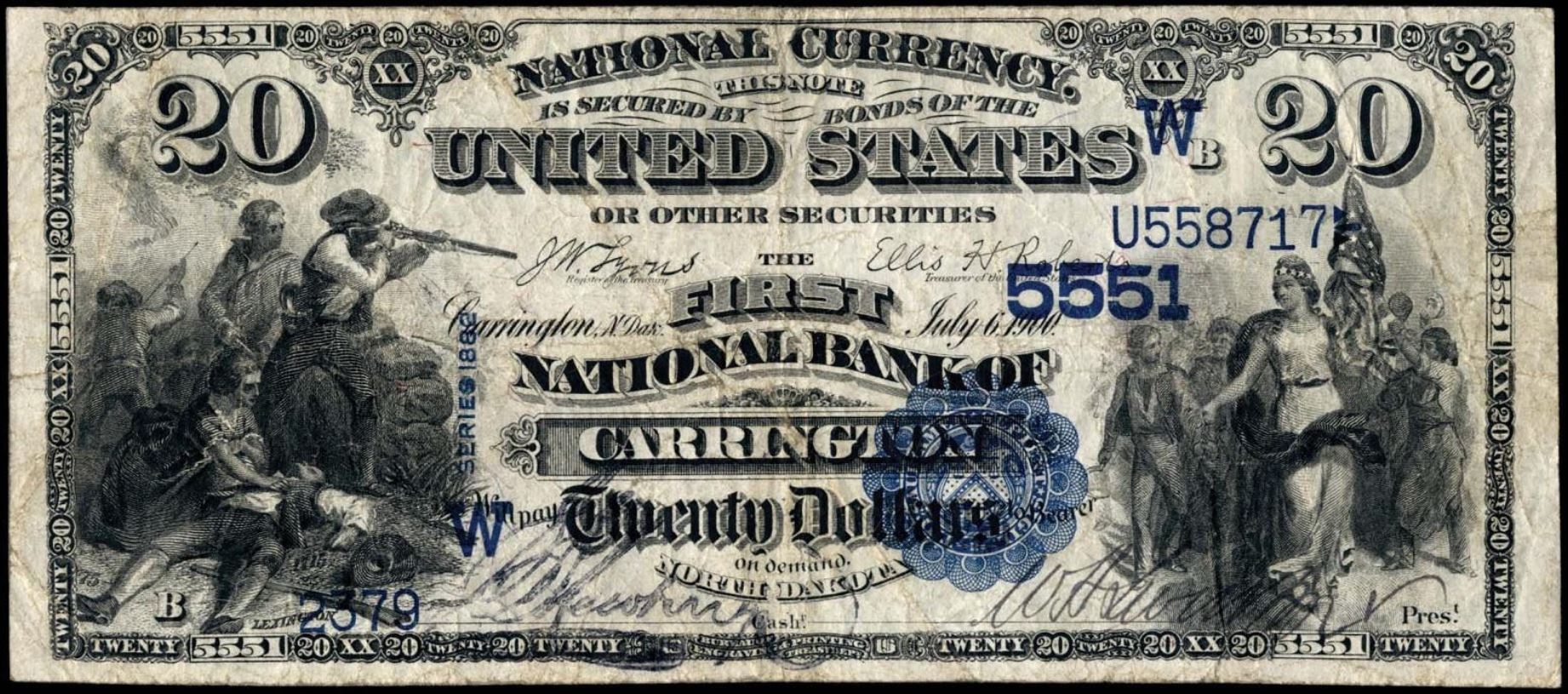 | ND | Carrington | 5551 | 1 | The First National Bank of | 1882VB | 20 | 2379 | B | N | Fine 15 | PMG | Image | |