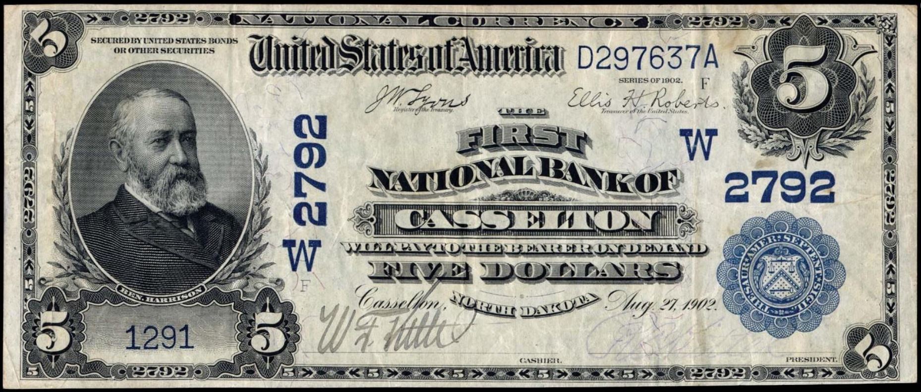 | ND | Casselton | 2792 | 1 | The First National Bank of | 1902DB | 5 | 1291 | F | N | VF 25 | PMG | Image | |