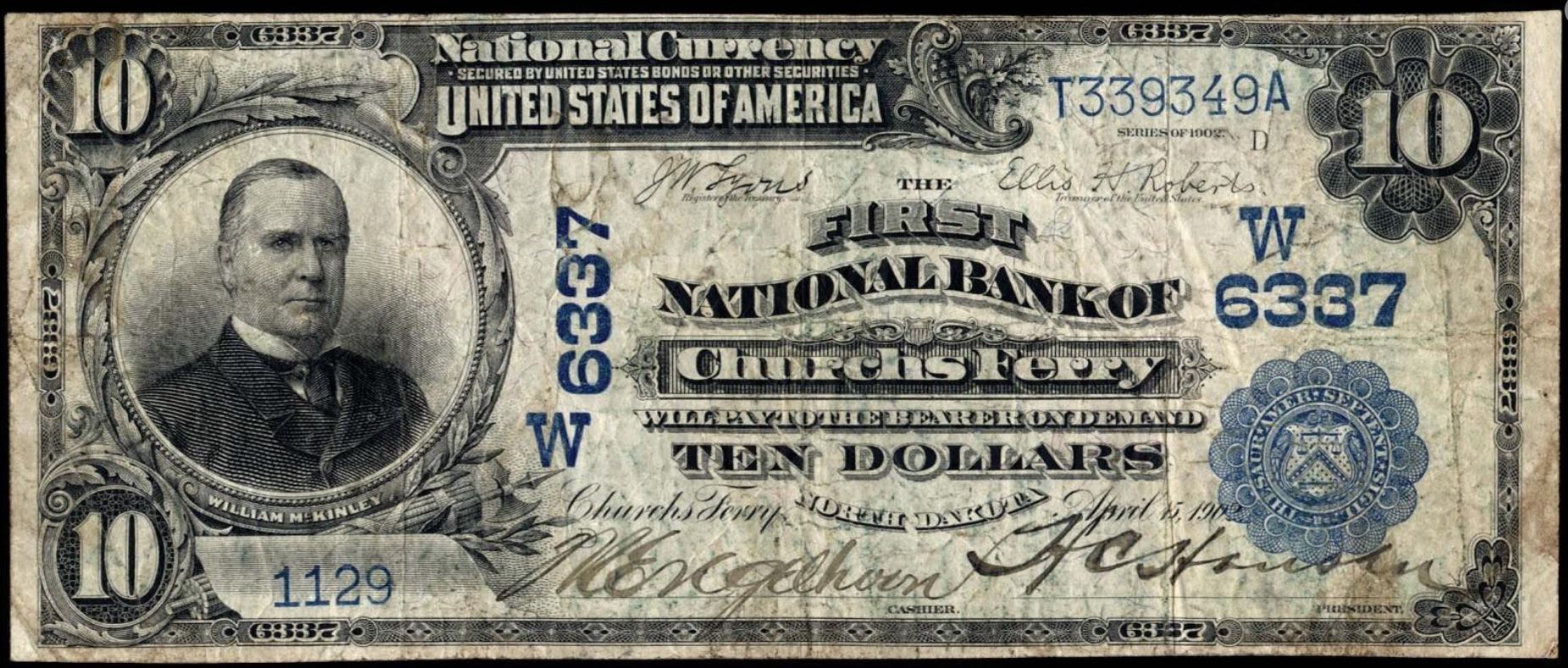 | ND | Churchs Ferry | 6337 | 1 | The First National Bank of | 1902DB | 10 | 1129 | D | N | Fine 12 | PMG | Image | |