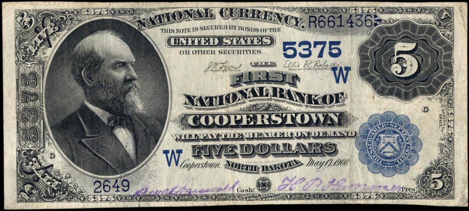 | ND | Cooperstown | 5375 | 1 | The First National Bank of | 1882VB | 5 | 2649 | G | N | VF 25 | PMG | Image | |