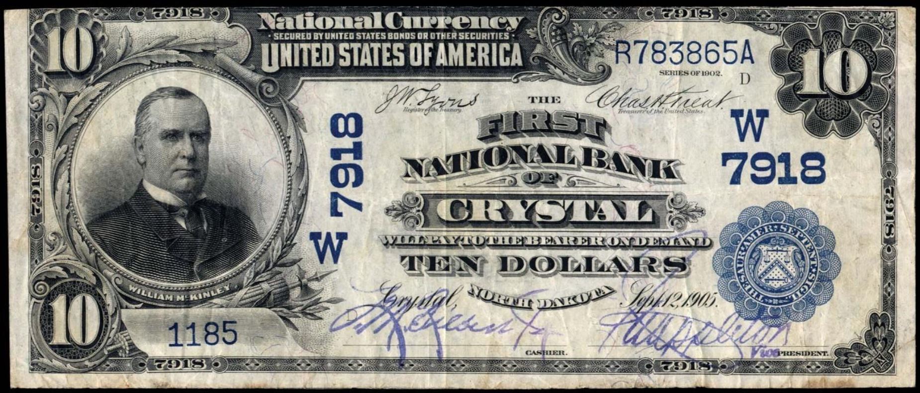 | ND | Crystal | 7918 | 1 | The First National Bank of | 1902DB | 10 | 1185 | D | N | VF 25 | PMG | Image | |