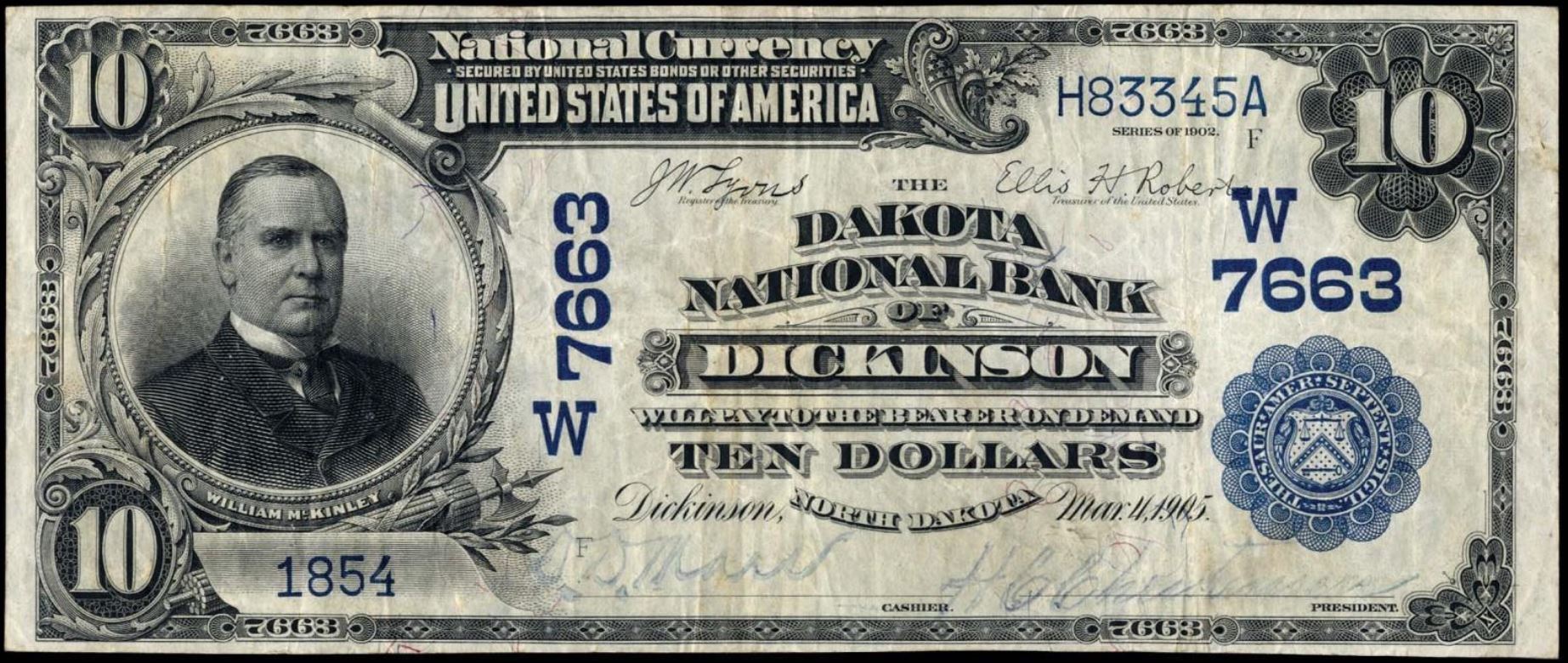| ND | Dickinson | 7663 | 1 | The Dakota National Bank of | 1902DB | 10 | 1854 | F | N | VF 25 | PMG | Image | |