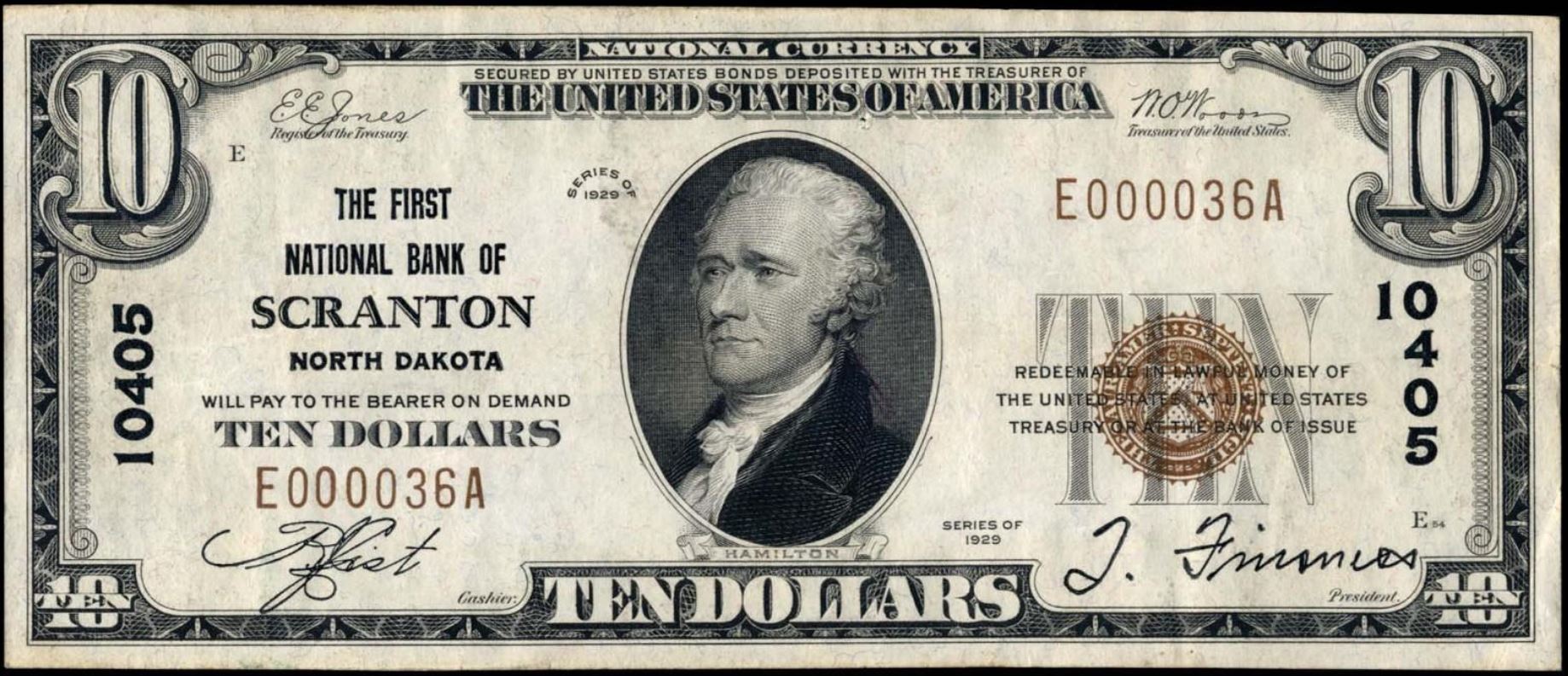 | ND | Scranton | 10405 | 1 | The First National Bank of | 1929T1 | 10 | 36 | E | N | VF 35 | PMG | Image | |