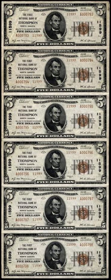 | ND | Thompson | 11599 | 1 | The First National Bank of | 1929T2 | 5 | 793 | N | Choice AU | Raw | Image | Uncut sheet SN: 793-798 | |