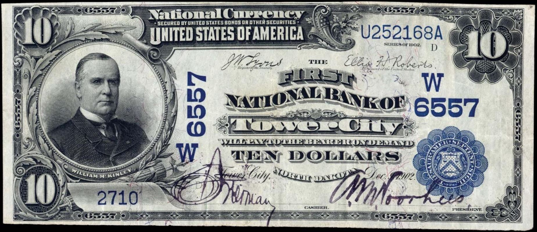 | ND | Tower City | 6557 | 1 | The First National Bank of | 1902DB | 10 | 2710 | D | N | VF 30 | PMG | Image | |